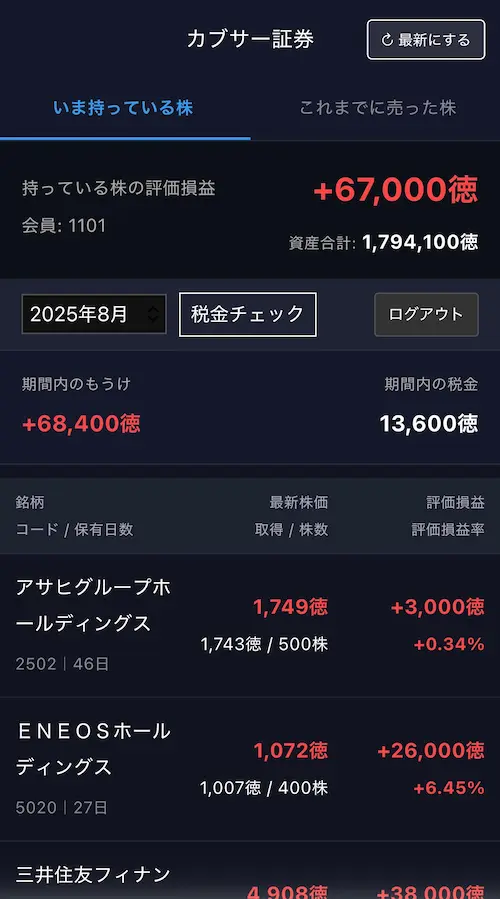 カブサー会員専用マイページでは、シミュレーション取引で売買した株の状況をいつでも確認できます。実際の市場と連動して株価がリアルタイムで変動するため、レッスンがない日でも自宅で保有株の損益をチェックすることが可能です。ご家庭での会話のきっかけや、学びを深めるためのツールとしてもご活用いただけます。